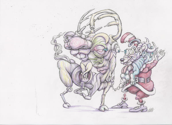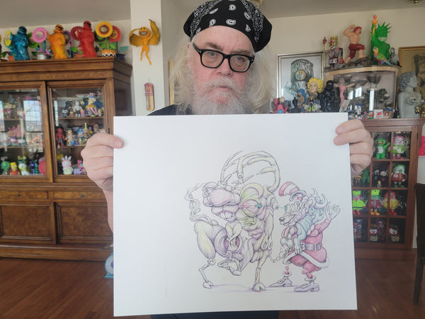 Original artwork: pen and colored pencil on paper, 17 x 14, signed. This drawing is part of a series used to create Ron's signature videos. See here.